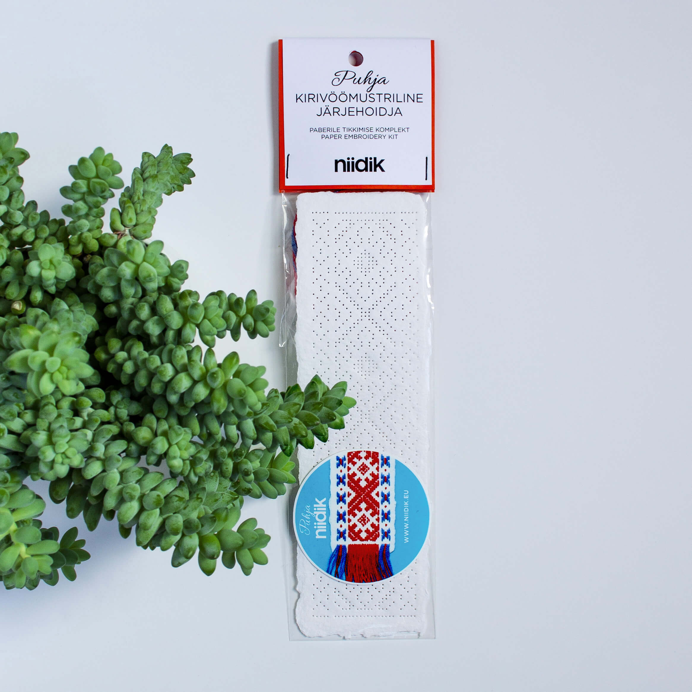Eelaugustatud Puhja kirivöö mustriga käsitööpaber. Tiki niidiga või värvi pliiatsitega.